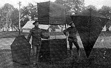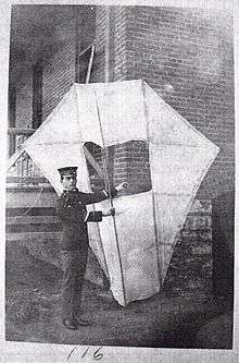 The first kite used by the United States Army Signal Corps specifically for raising an antenna was designed and built by Sergeant Thomas I. King, Signal Corps Company A, while stationed at Fort Leavenworth, Kansas, in 1905. The “King” kite was large, 7 feet high and 5 feet wide, made of 50 yards of white Japanese silk on a bamboo frame, and weighed less than 2 pounds.[2] Similar to Silas J. Conyne's kite of 1902,[3] it had a diamond shape with a squared-off top and bottom, keel, and large opening in the center to gave it some of the stability of a box kite. It was used either singly or in trains of 2 to 4 kites or, on less windy days, in conjunction with a balloon to provide extra lift.