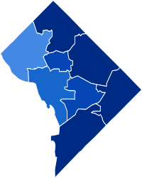 The District of Columbia voted by an extremely large margin in favor of the Democratic candidate Al Gore with 85% of the vote. Bush got 9% with 18,000 votes compared to Nader who got 5% with 10,000 votes.[1] A total of 44% of the population came out to vote.[2] This can be attributed to the fact that D.C. only encompasses an urban core area (and those are generally very liberal in nature). The District of Columbia has never voted for a Republican.