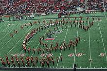 The UC Bearcat Band forms a C-Paw during their pre-game show.