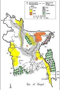 Most Bangladeshis earn their living from agriculture.[23] Although rice and jute are the primary crops, maize and vegetables are assuming greater importance.[23] Due to the expansion of irrigation networks, some wheat producers have switched to cultivation of maize which is used mostly as poultry feed.[23] Tea is grown in the northeast.[23] Because of Bangladesh's fertile soil and normally ample water supply, rice can be grown and harvested three times a year in many areas.[23] Due to a number of factors, Bangladesh's labour-intensive agriculture has achieved steady increases in food grain production despite the often unfavourable weather conditions.[23] These include better flood control and irrigation, a generally more efficient use of fertilisers, and the establishment of better distribution and rural credit networks.[23] With 28.8 million metric tons produced in 2005-2006 (July–June), rice is Bangladesh's principal crop.[23] By comparison, wheat output in 2005-2006 was 9 million metric tons.[23] Population pressure continues to place a severe burden on productive capacity, creating a food deficit, especially of wheat.[23] Foreign assistance and commercial imports fill the gap,[23] but seasonal hunger ("monga") remains a problem.[25] Underemployment remains a serious problem, and a growing concern for Bangladesh's agricultural sector will be its ability to absorb additional manpower.[23] Finding alternative sources of employment will continue to be a daunting problem for future governments, particularly with the increasing numbers of landless peasants who already account for about half the rural labour force.[23] Due to farmers' vulnerability to various risks, Bangladesh's poorest face numerous potential limitations on their ability to enhance agriculture production and their livelihoods. These include an actual and perceived risk to investing in new agricultural technologies and activities (despite their potential to increase income), a vulnerability to shocks and stresses and a limited ability to mitigate or cope with these and limited access to market information.[25]