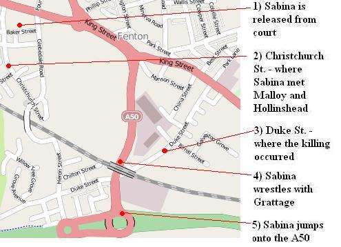 On 19 May 2008, Sabina was released from court without a full psychiatric evaluation having pleaded guilty to trespass on the motorway and hitting a police officer.[1] The court sentenced her to one day in custody which she had been deemed to have served having spent a full night in police custody. Leaving court she began to wander the streets of Stoke-on-Trent, seemingly attempting to reach her sister in hospital, carrying her possessions in a clear plastic bag given to her by police.[9]