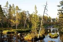The Vätsäri Wilderness Area (Finnish: Vätsärin erämaa, Swedish: Vätsäriområdet) is located along the northeastern shore of Lake Inari in Inari, northern Finland, stretching all the way to the Finland–Norway border. The landscape is dominated by taiga forests of Scots pine, bog and bodies of water. The northeastern part rises as a treeless fell ridge. Vätsäri is one of twelve wilderness areas in Lapland and covers an area of 1,550 square kilometers (600 sq mi).[1] The wilderness has one marked trail and a few cabins. The reserve is under the management of Metsähallitus (Administration of Forests) and was established with the other wilderness reserves in 1991. It is part of Pasvik–Inari Trilateral Park along with Øvre Pasvik National Park and Øvre Pasvik Landscape Protection Area in Norway, and the joint Norwegian–Russian Pasvik Nature Reserve.