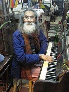 Vu Dan Tan playing piano in his gallery in Hanoi in 2008