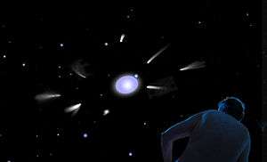 Based on an observed excess emission of infrared radiation, Vega appears to have a circumstellar disk of dust. This dust is likely to be the result of massive collisions between objects in an orbiting debris belt, and it is analogous to the Kuiper belt in the Solar System.[4] Irregularities in the disk also suggest the presence of at least one planet, about the size of Jupiter, in an orbit large enough to allow the formation of smaller rocky planets closer to the star.[5] Regardless of its ultimate tally of planetary companions, the fact that it has an estimated age of just 455 million years[2] suggests that the Vega system is too young to have fostered the development of life or a complex biosphere on any of its worlds.