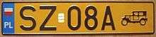 These plates use black text on a yellow background with an additional picture of a vintage car on the right side. Only cars older than 25 years, out of production for 15 years and containing at least 75% of original parts are eligible to be registered as classic cars, with an exception of prototypes that were never produced, cars of considerable historical value or "being an example of original or important technological solutions". These plates are issued on a case by case rules.