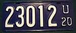 | 1920 | White on blue, "U" at top right over "20" | none | 12345 | 5000 to approximately 41500 | Dealer and truck plate serials same as 1919. | |