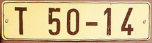 The plates' appearance remained largely constant during the 37 years in which they were issued. Black alphanumerics rendered in a condensed version of DIN 1451 were used (although other fonts have also been observed),[1] with the first letter indicating the bezirk (the German word for 'district') where the vehicle was registered. Between 1953 and 1974, the format of these plates was XX ##-##, where X is any letter in the range A-Z, and # is a digit between 0 and 9 – although a numerical prefix and/or suffix of '00' was disallowed.