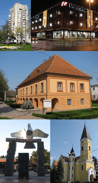 From top left: Vodotoranj (Water Tower Building), Mercator department store in city centre, Turopolje Museum, Monument to fallen soldiers in the Croatian War of Independence, Parish Church of the Annunciation of the Blessed Virgin Mary | ||