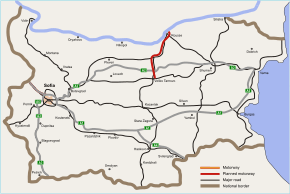 The Veliko Tarnovo–Ruse motorway (Bulgarian: Автомагистрала „Велико Търново–Русе“, Avtomagistrala "Veliko Tarnovo–Ruse") is a planned motorway in Northern Bulgaria, that will link Veliko Tarnovo and Ruse, at the Danube border crossing to Romania.[1] It will span for approximately 118 kilometers (73 mi), superseding the existing major road 5. Along with Hemus motorway (A2), Veliko Tarnovo–Ruse motorway aims to provide motorway connection between Sofia and Bucharest, the capitals of Bulgaria and Romania. Also it follows the route of European route E85 and Pan-European Corridor IX. In March 2015, a tender for conceptual design was announced.[2]