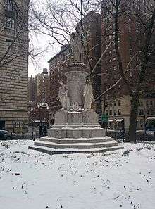 In the center of Verdi Square stands a monument to the opera composer Giuseppe Verdi, erected in 1906.[3] A statue of him by Pasquale Civiletti (1858–1952) stands at the top of it and statues of four of his most famous characters (Falstaff on the west side of the statue, Leonora of La forza del destino on the south side, Aida on the north side and Otello on the east side) are on the base below him. In the landscaping devised by Lynden Miller in 2004, flowers around the statue bloom in the spring and summer months.[2]