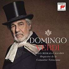 Verdi is a 2013 album of baritone arias by the 72-year-old Plácido Domingo, returning to the baritone register of his youth. The album, the first collection of baritone arias by the singer, was released by Sony Classics on 27 August 2013.[1] Domingo is accompanied by the Cor de la Generalitat Valenciana and the Orquestra de la Comunitat Valenciana conducted by Pablo Heras-Casado. The album won a Latin Grammy in 2014 for Best Classical Album.