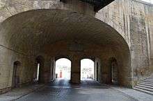 The gate originally had a drawbridge and a ditch. The ditch was filled in over the years, but it was uncovered and restored in 2010.[3]