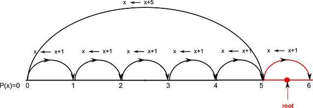 See the corresponding diagram where the root lies in the interval (5, 6). It can be easily inferred that, if the root is far away from the origin, it takes a lot of time to find its integer part this way, hence the exponential nature of Vincent's method. Below there is an explanation of how this drawback is overcome.