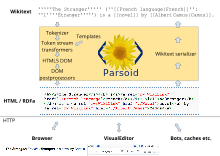 The Wikimedia Foundation joined forces with Wikia to work on the project.[18] The implementation encountered challenges with the wiki markup language (the basis for Wikipedia articles), due to it being continuously extended over 12 years to include seldom-used rich and complex features making reproduction of the final article appearance dependent on many factors that were not easy to reproduce.[19] The technical implementation required improvements to MediaWiki in parsing, wiki markup language, the DOM and final HTML conversion.[20] A necessary component is a parser server called Parsoid[note 3] which is written in Node.js and was created to convert in both directions between wikitext and a format suitable for VisualEditor.[19] The Wikimedia Foundation considered VisualEditor its most challenging technical project to date.[5]