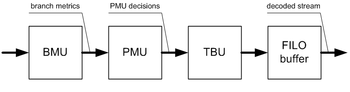 A hardware Viterbi decoder for basic (not punctured) code usually consists of the following major blocks: