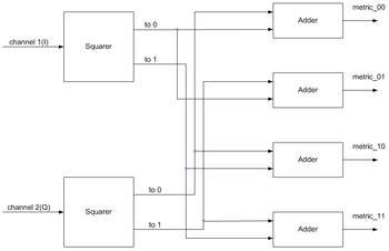 where, the signs of each term depend on symbols, vi(0) and vi(1), being compared. Thus, the squared Euclidean metric distance calculation to compute the branch metric may be performed with a simple add/subtract operation.