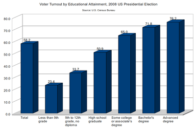 Income and educational attainment are significant factors affecting voter turnout. Educational Attainment is perhaps the best predictor of voter turnout, and in the 2008 election those holding advanced degrees were three times more likely to vote than those with less than high school education. Income correlated well with likelihood of voting as well, although this may be because of a correlation between income and educational attainment, rather than a direct effect of income.