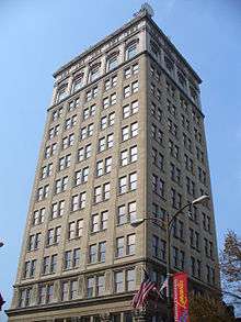 The W.W. Griest Building, also known as the Lancaster Federal Building and PP and L Building, is a historic skyscraper located in the city of Lancaster, Pennsylvania. It was designed by noted Lancaster architect C. Emlen Urban and built 1924-1925. It is built in the Italian Renaissance Revival style and is a steel frame building faced in granite, limestone, and terra cotta. The Griest Building is fourteen stories tall and each floor measures 66 feet by 55 feet, or 3,600 square feet. The 12th floor, now office space, once housed a 300-seat auditorium with a green and gold frescoed ceiling. A 53 foot tall tower was added to the top of the building in 1976.[3] The W.W. Griest Building is the second tallest building in the city of Lancaster.[4]