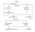 In two-stage process, reaction and oxidation are carried out separately in tubular reactors. Unlike one-stage process, air can be used instead of oxygen. Ethylene is passed through the reactor along with catalyst at 105–110 °C and 900–1000 kPa.[27] Catalyst solution containing acetaldehyde is separated by flash distillation. The catalyst is oxidized in the oxidation reactor at 1000 kPa using air as oxidizing medium. Oxidized catalyst solution is separated and sent back to reactor. Oxygen from air is used up completely and the exhaust air is circulated as inert gas. Acetaldehyde – water vapor mixture is preconcentrated to 60–90% acetaldehyde by utilizing the heat of reaction and the discharged water is returned to the flash tower to maintain catalyst concentration. A two-stage distillation of the crude acetaldehyde follows. In the first stage, low-boiling substances, such as chloromethane, chloroethane and carbon dioxide, are separated. In the second stage, water and higher-boiling by-products, such as chlorinated acetaldehydes and acetic acid, are removed and acetaldehyde is obtained in pure form overhead.[27] Due to corrosive nature of the catalyst, the equipments in contact with it are lined with titanium.