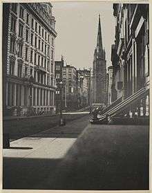 Wall Street's architecture is generally rooted in the Gilded Age, though there are also some art deco influences in the neighborhood. The streets in the area were laid out prior to the Commissioners' Plan of 1811, a grid plan that dictates the placement of most of Manhattan's streets north of Houston Street. Thus, it has small streets "barely wide enough for a single lane of traffic are bordered on both sides by some of the tallest buildings in the city", according to one description, which creates "breathtaking artificial canyons" offering spectacular views in some instances.[25] Construction in such narrow steep areas has resulted in occasional accidents such as a crane collapse.[62] One report divided lower Manhattan into three basic districts:[25]