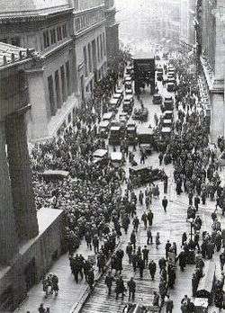 A crowd at Wall and Broad streets after the 1929 crash. The New York Stock Exchange is on the right. The majority of people are congregating in Wall Street on the left between the "House of Morgan" (23 Wall Street) and Federal Hall National Memorial (26 Wall Street).
