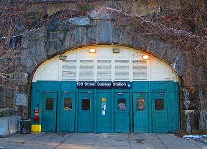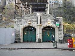 Traversal of the elevation change can also be used using the three massive elevators within the 181st Street subway station, with entrances on Overlook Terrace and Fort Washington Avenue.[87] A similar situation exists at 190th Street. When originally built, fare control for both of these stations was in the station house, outside the elevators, which meant that they could only be used by paying a subway fare, but both have had fare control moved down to the mezzanine level, making the elevators free for neighborhood residents to use, and providing easier pedestrian connection between Hudson Heights and the rest of Washington Heights.[88]