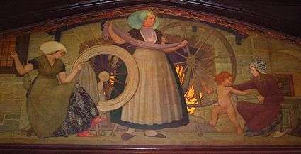 The school's interior varies. The lobby's walls are covered by wood panels, and toward the ceiling there are murals depicting the history of New York. Many are by the noted muralist, Barry Faulkner. In the middle of the lobby, there is a grand decorative fireplace. Guests enter the building through the main door, which is opposite the fireplace. Above the fireplace are statues of women carved from a single piece of white stone; the statues are covered by the American flag. On the second floor and above, the walls are white, the doors are red, and the floors are black. The exterior is limestone up to the second story, then gray brick trimmed with limestone. On the corner of Irving Place and 17th Street is a bust of Washington Irving by Friedrich Beer, which is featured on the school's ID. The exterior was used in the TV sit-com Head of the Class. The school's auditorium is located in the middle, between the left and the right wings. It is usually accessed only from the lobby, but has seats on the second level. There are many performances held at the auditorium, by students and outside artists.
