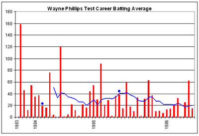 Phillips' batting in the second test against New Zealand helped Australia achieve a rare victory. However his form behind the stumps against the spinners was increasingly poor, and caused a drop in his confidence which in turn affected his batting.[33] In the second test against India he missed two easy stumpings, causing Alan Border to come to his defence: "I feel sorry for Wayne," he said. "He's had a couple of bad tracks to keep on. He feels he is letting down the side. But I hope we stick with him. I don't believe there is a 'keeper in the country capable of doing any better."[34]