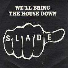 "We'll Bring The House Down" is a single from rock band Slade from their 1981 album of the same name.[1] It was written by lead singer Noddy Holder and bassist Jim Lea. After years of touring in small venues and releasing a string of unsuccessful singles and albums, the single was the first Top Thirty hit for Slade since 1976, peaking at number ten in the UK during a chart run of nine weeks.[2] This was largely thanks to the Reading festival the year before after Ozzy Osbourne's band had pulled out at the last minute and Slade agreed to step in instead. The band stole the show and became hot news once again.[3]