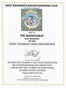 West Bromwich Mountaineering Club (WBMC) is one of the oldest and most active climbing and hill-walking clubs in the West Midlands. It meets at "The Wheatsheaf" on West Bromwich High Street every Thursday night, holding a series of talks on the second Thursday of the month in winter. It has a membership of almost 300 and every month runs a coach to a mountainous region in England or Wales, on which seats are available to its members and the general public on a 'first come - first served' basis and also maintains a members-only hut in the Nant Gwynant valley. It affiliated to the British Mountaineering Council in 2003 and became a Community Association Sports Club (CASC) in 2005.