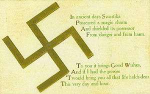 The 45th Infantry Division of the United States Army used a yellow swastika on a red background as a unit symbol until the 1930s, when it was switched to a thunderbird.[38][39][40] The American Division wore the swastika patch while fighting against Germany in World War I.
