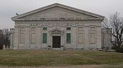 The Westlawn Mausoleum was designed by New York architect Henry Bacon, designer of the Lincoln Memorial in Washington, D.C.[2] The structure, costing in excess of $460,000, was built between 1913 and 1915.[2] The Classic Revival and Greco-Roman Temple mausoleum was officially dedicated on September 12, 1915.[2] The structure is made from the same Colorado-Yule marble as the Lincoln Memorial.[2]