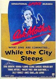 While the City Sleeps is a 1956 film noir directed by Fritz Lang. Written by Casey Robinson, the newspaper drama was based on The Bloody Spur by Charles Einstein, which depicts the story of "Lipstick Killer" William Heirens. The film features Dana Andrews, Rhonda Fleming, George Sanders, Howard Duff, Thomas Mitchell, Vincent Price, John Drew Barrymore and Ida Lupino.[1]