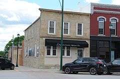 The White, Munger and Company Store is a historic building located in Winterset, Iowa, United States. Built in 1861 by Evan V. Evans who owned the property the building sits on, it is an early example of a vernacular limestone commercial building.[2] The two-story structure is composed of locally quarried ashlar and rubble stone. It features a false front that hides the gable roof, a parapet with a bracketed stone cornice and cornice return. The storefront has subsequently been altered. White, Munger and Company operated a woolen mill east of town, and this store was associated with the mill. The building was individually listed on the National Register of Historic Places in 1987,[1] and it was included as a contributing property in the Winterset Courthouse Square Commercial Historic District in 2015.[3]