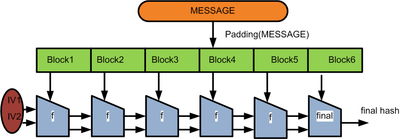 - For example, let's say the message to be hashed is "HashInput" and the block size of the compression function is 8 bytes (64 bits). So we get two blocks looking like this: