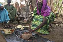 Trees of note include the shea tree (known as "Karité" in the local Dioula language and the baobab.[1] Although the shea tree is indigenous to the semi-arid Sahel region of West Africa, Burkina Faso contains the largest number of them.[3] The shea tree is extremely important to the Burkinabe people and is termed as "women's gold" by the villagers, because the nuts of shea tree can be collected and then processed by crushing and grinding to yield shea butter, important in cuisine and in exports, for use in the manufacture of chocolate and cosmetics such as soap.[3] Shea nuts are the country's third most important export, after cotton and livestock; in 1997, an average tonne of unprocessed shea nuts sold domestically for CFA70,000 (US$980) and overseas for CFA1,00,000 (US$1400).[3] The most important centres of shea butter production are in Sissili Province and Ziro Province.[3] The bark of the tree is also used as an ingredient in traditional medicines and the shell of nut is said to be able to repel mosquitoes and is also said to protect existing trees.[3] The Bambara groundnut (Vigna subterranea) is also grown in abundance; Burkina Faso produced some 20,000 tonnes in 1989, after peanuts (160,000 tonnes) and cowpeas (74,000 tonnes).[17] Between 1982 and 1985, an attempt was made to improve the Bambara groundnut, an initiative which involved the participation of plant breeders in the Grain Legumes Programme.[17]