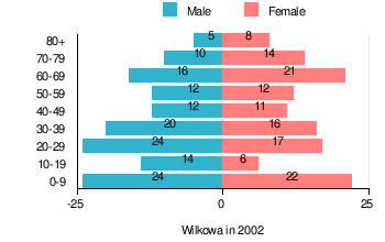 According to the 2002 Poland census, there were 264 people residing in Wilkowa village, of whom 51.9% were male and 48.1% were female. In the village, the population was spread out with 23.5% under the age of 18, 33.7% from 18 to 44, 17.8% from 45 to 64, and 25% who were 65 years of age or older.[1]