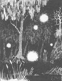 In the Dungeons & Dragons fantasy roleplaying game the will-o'-wisp is a malevolent entity which makes its home in swamps and bogs. This aberration consists of a bizarre, spongy substance which hovers through telekinesis in the air, enveloped in a mysterious glow of yellow, white, green or blue.