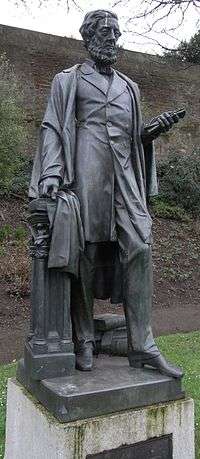 A bronze statue was made of the Earl by the Exeter sculptor Edward Bowring Stephens [3] and in October 1880 [4] was erected at the front of the central garden in Bedford Circus, Exeter, on the spot where Stephens' "The Deer Stalker" had formerly stood. (The latter statue now stands near the Earl's statue, both having been re-located in Northernhay Gardens). The unveiling ceremony was attended by Sir Stafford Northcote (1818-1887), later Lord Lieutenant of Devon 1886-7, (whose own statue in Northernhay Gardens now stands nearby) with the Mayor and Corporation, other dignitaries and the Earl himself. The statue was paid for by public subscription to the Devon Statue Fund, which had attracted 1,300 signatories for this work. A banquet was held following the unveiling ceremony. The plinth is of Cornish granite from the Cheesewring Quarries, on the rear of which a bronze plaque is affixed inscribed with verse from Wordworth's Happy Warrior: