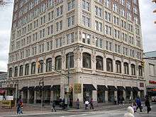 - Johnston Building, Charlotte, North Carolina (1924): It is located at 212 South Tryon Street. At 15 stories, this was Charlotte’s tallest building when it opened; two more floors were added in the late 1920s. The lobby is particularly noteworthy because it runs the length of the building with marble columns, a marble staircase, and an arched, coffered ceiling. The building had been commissioned by Charles Worth Johnston (1861–1941), president of Johnston Mills Company in addition to other textile and banking interests.[43]