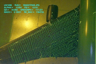 Compilation of images taken during an alpha run starting at 0 degrees alpha ranging to 26 degrees alpha. Images taken at the Kirsten Wind Tunnel using fluorescent mini-tufts. Notice how separation starts at the outboard wing and progresses inward. Notice also how there is delayed separation aft of the nacelle.