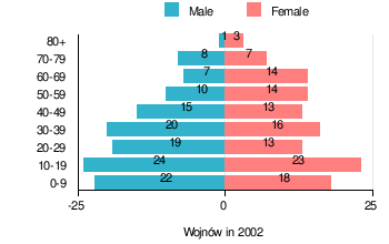 (by age group in 2002)TOTAL 0-9 10-19 20-29 30-39 40-49 50-59 60-69 70-79 80 + I. TOTAL person 247 40 47 32 36 28 24 21 15 4 — of which in % 100 16.2 19 13 14.6 11.3 9.7 8.5 6.1 1.6 1. BY SEX A. Males person 126 22 24 19 20 15 10 7 8 1 — of which in % 51 8.9 9.7 7.7 8.1 6.1 4 2.8 3.2 0.4 B. Females person 121 18 23 13 16 13 14 14 7 3 — of which in % 49 7.3 9.3 5.3 6.5 5.3 5.7 5.7 2.8 1.2