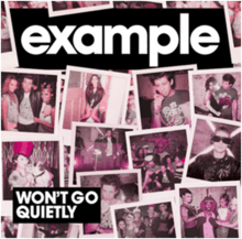 "Won't Go Quietly" is a song by British recording artist Example. This is the second single from Example's second album, Won't Go Quietly. The song was available to download on 17 January 2010,[4] with a physical single release on 18 January 2010. The song was used on 29 January 2010 by Channel 4 on Celebrity Big Brother 2010 as Stephanie Beacham's "Best Bits" song after her eviction and in France by W9 on the opening sequence of the French TV reality show Dilemme between 20 May and 15 July 2010.[5]