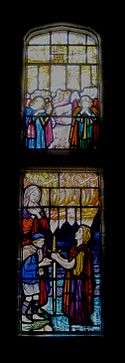 Hallward took the theme of the “Pilgrim's progress” for the windows of the Chigwell School in Chigwell, Essex[13] in 1924. He did this by depicting schoolboys as Christian's companions on his pilgrimage and contextualises Bunyan's allegory perfectly. In the left-hand window Christian starts off on his journey carrying his "burden" on his back as he walks forward, leaving the "City of Destruction" for the "Celestial City", and face the temptations ahead. Schoolboys are depicted as his fellow pilgrims.[14]