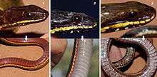 This snake is brown above, with or without darker spots and with a more or less distinct paler dorsolateral band. The lower parts are cherry-red to purplish-black, with a yellow band on each side extending from the lips to the end of the tail. Total length is two feet, and the tail is 5.5 inches.[2]