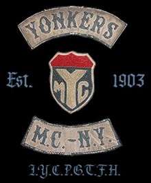 The Yonkers Motorcycle Club (YMC) was formed in 1903 in Yonkers, New York by George Eller. Since 1927, the club has been chartered by the American Motorcyclist Association.[1] The YMC claims to be the oldest active motorcycle club in the United States,[2][3] which is disputed by the Portsmouth Motorcycle Club of Ohio.[4] The club motto is "If Ya Can't Party, Go The Fuck Home!".
