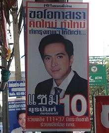 Yuranunt Pamornmontri (Thai: ยุรนันท์ ภมรมนตรี; rtgs: Yuranan Phamonmontri, nicknamed Sam) (born 2 January 1963) is a Thai actor and politician. He was Members of the House of Representatives from 2005 to 2006, when Prime Minister Thaksin Shinawatra was deposed in a military coup and convicted in absentia for a conflict of interest. He was born in Bangkok and started his career as actor. He was elected as party-list MP again in 2011 general election, substituting resigned Police Lieutenant General Chatt Kuldilok.