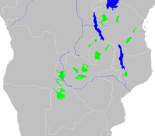 The Zambezian flooded grasslands can be found on seasonally or permanently flooded lowlands in the basin of the Zambezi and neighboring river basins. These enclaves lie in the broad belt of dry and not very fertile miombo and mopane savannas and woodlands that extend east and west across Africa, in broad band from northern Botswana and Namibia in the west to Tanzania and Mozambique in the east.
