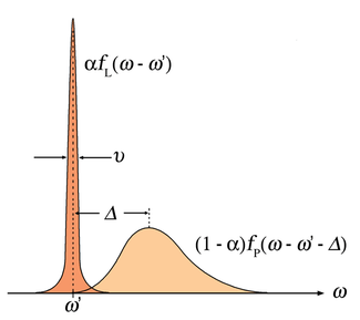 Figure 1 shows the typical line shape for electronic transitions of individual chromophores in a solid matrix. The zero-phonon line is located at a frequency ω’ determined by the intrinsic difference in energy levels between ground and excited state as well as by the local environment. The phonon sideband is shifted to a higher frequency in absorption and to a lower frequency in fluorescence. The frequency gap Δ between the zero-phonon line and the peak of the phonon side band is determined by Franck–Condon principles.