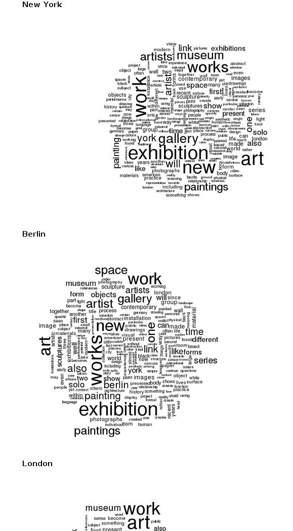Word clouds (don’t worry, there are heat maps as well ;-) ) of words from shows by city.